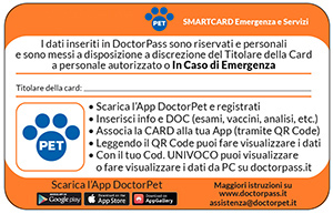 Ogni Utente (privato o Business) può acquistare e Associare una CARD o una MEDAGLIETTA con una “replica” fisica del Codice Qr e del Codice UNIVOCO. Utile per visualizzare i propri dati da chi non utilizza tecnologie, come backup per l’utilizzo delle funzioni DoctorPet in caso di telefono rotto, scarico, smarrito o semplicemente per una visualizzazione “a distanza” su PC. L’acquisto può avvenire  in un qualsiasi momento per associare la CARD basterà utilizzare la funzione automatica della App “Associa MEDAGLIETTA o CARD” (anche per l’Utente Business che la riceve dall’Azienda/Associazione).